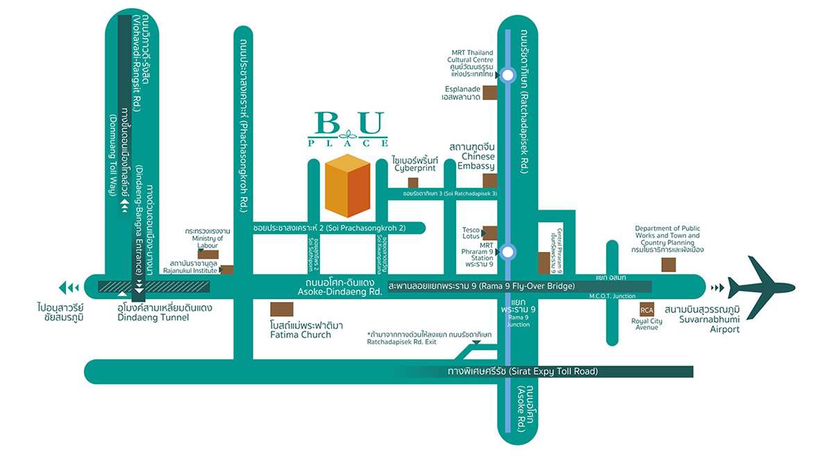 B.U.Place is located right in the heart of Bangkok. We are situated at the beginning of Ratchadaphisek Road, Soi 3 or commonly known as Chinese Embassy.