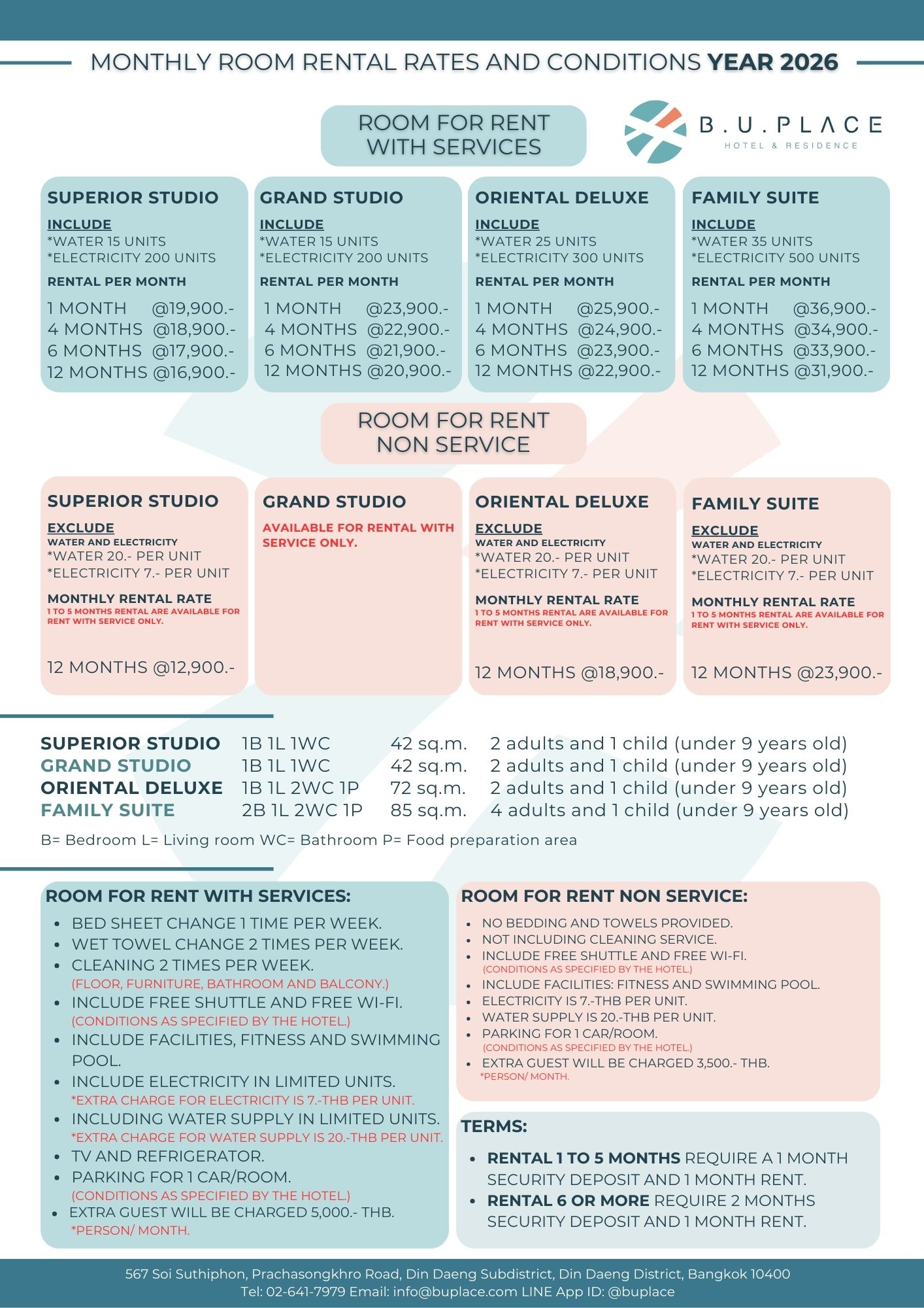 อัตราค่าเช่าห้องรายเดือนและเงื่อนไขสำหรับห้องทุกประเภท — แพ็กเกจแบบมีบริการ